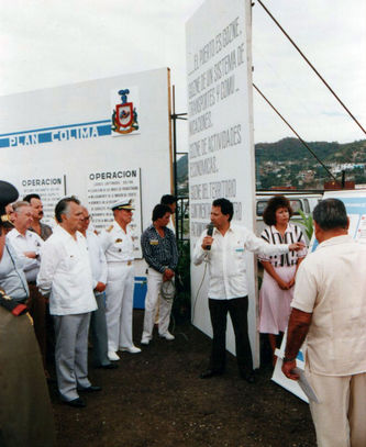 El Presiente Miguel de la Madrid, el Secretario de Comunicaciones y Transportes, Rodolfo Félix Valdés, la Gobernadora Griselda Álvarez y el licenciado Juan Filigrana Castro, Director General de la paraestatal Servicios Portuarios de Manzanillo, en la gira por el puerto donde se acordó impulsar a Manzanillo como el principal puerto comercial del pacífico mexicano, aprovechando su privilegiada ubicación geográfica.